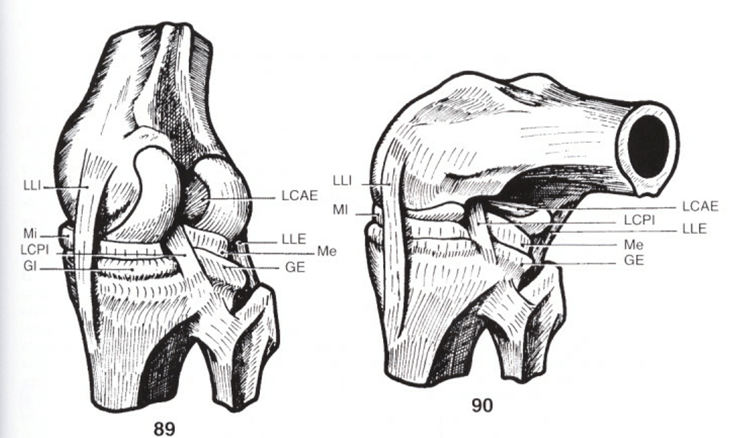 - Laterales: ligamento colateral lateral (LCL) y ligamento colateral medial (LCM), encargados de limitar los movimientos laterales de la tibia,