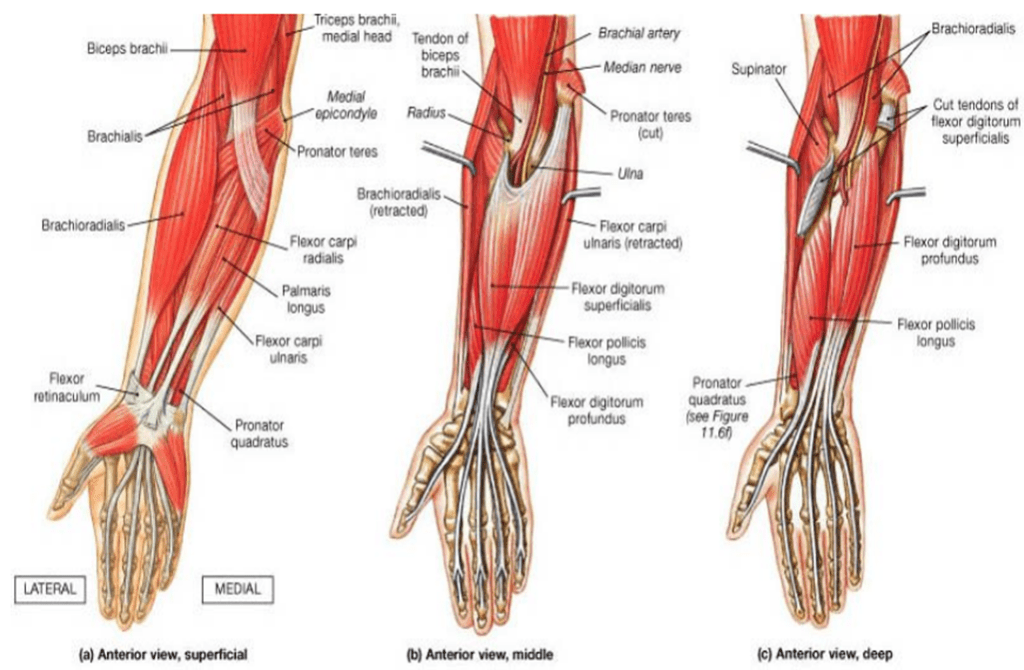 - Acción: Pronación y flexión del antebrazo.
